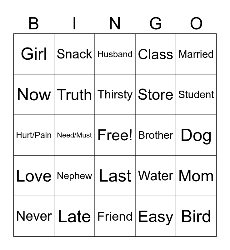 This bingo card has a free space and 94 words: Help, Family, Friend, Neighbor, Neighborhood, Town, City, Never, Hope, Feeling, Make, Take, Keep, Store, Money/Buy, Married, Husband, Wife, Divorce, Dating, Aunt, Uncle, Cousin, Niece, Nephew, Truth, Lie, Go, Hurry, Fast, Late, Last, Early, First, Snack, Hate, Live/Life/Alive, Hungry, Thirsty, Water, Hurt/Pain, Love, Dog, Cat, Bird, Pet, Always, Still, Forever, Work, Hard, Easy, Start, Finish, Stop, All, Many, Thing, Whatever, Want, Need/Must, Know, Don’t Know, Understand, Remember, Forget, Red, Today, Now, Yesterday, In the past, In the future, School, High School, Class, Classroom, Learn, Student, Mom, Grandmother, Dad, Grandfather, Boy, Brother, Girl, Sister, Baby, Child, Home, Room, Day, Night, Week and Month.