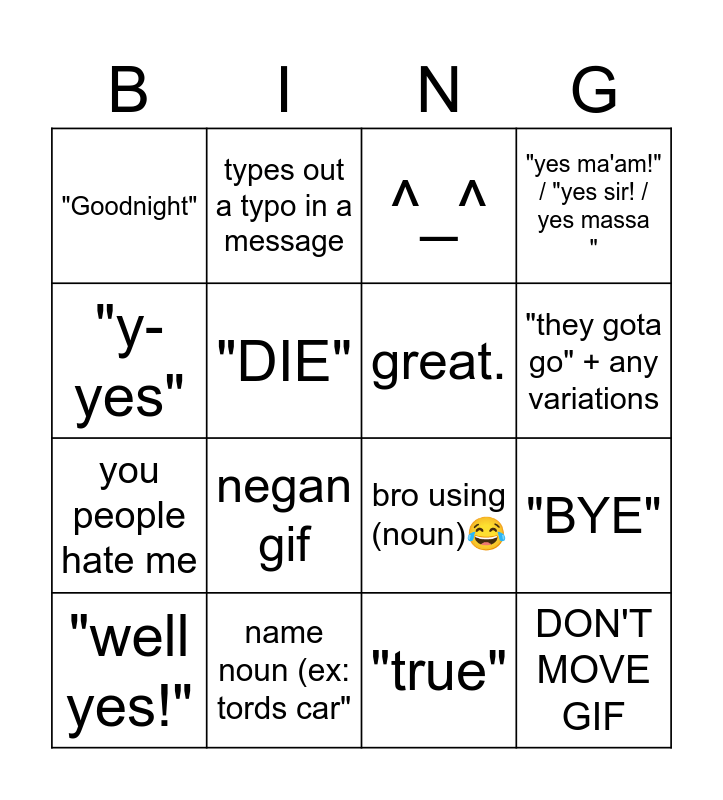 This bingo card has 31 words: "stolen gif", dax gif, "BYE", "I'm leaving", "Goodnight", ^_^, great., "o-ok", name noun (ex: tords car", "this is tordcore", "true", "well yes!", :3, retypes out what is said on an image, negan gif, "can we kill / can we hit with rocks..", monkey gif, YOU'RE NOT GETTING ANY OF MY MONEY / NO I WON'T, DON'T MOVE GIF, beatles gif, "y-yes", dog gif, hetalia gif, types out a typo in a message, you people hate me, "DIE", "yes ma'am!" / "yes sir! / yes massa ", bro using (noun)😂, weird hetalia image, "they gota go" + any variations and 👎.