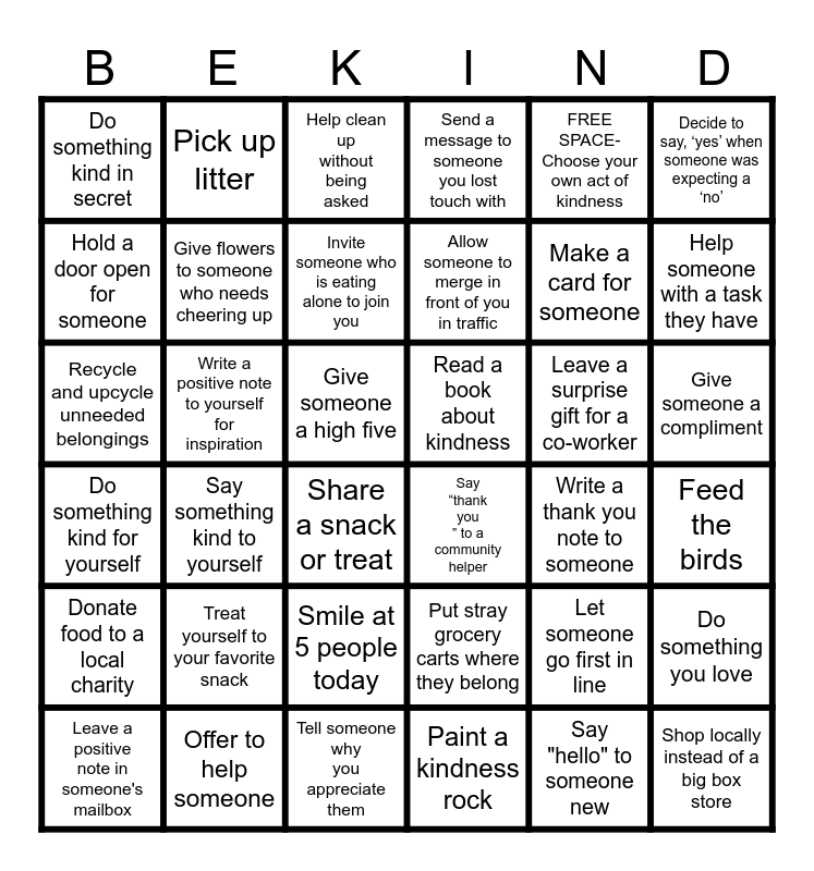 This bingo card has 36 words: Put stray grocery carts where they belong, Smile at 5 people today, Paint a kindness rock, Hold a door open for someone, Do something kind for yourself, Read a book about kindness, Give flowers to someone who needs cheering up, Tell someone why you appreciate them, FREE SPACE- Choose your own act of kindness, Let someone go first in line, Help someone with a task they have, Send a message to someone you lost touch with, Do something you love, Write a positive note to yourself for inspiration, Allow someone to merge in front of you in traffic, Do something kind in secret, Donate food to a local charity, Leave a surprise gift for a co-worker, Recycle and upcycle unneeded belongings, Help clean up without being asked, Give someone a high five, Say something kind to yourself, Say “thank you ” to a community helper, Share a snack or treat, Write a thank you note to someone, Pick up litter, Make a card for someone, Offer to help someone, Invite someone who is eating alone to join you, Decide to say, ‘yes’ when someone was expecting a ‘no’, Shop locally instead of a big box store, Leave a positive note in someone's mailbox, Feed the birds, Give someone a compliment, Treat yourself to your favorite snack and Say "hello" to someone new.