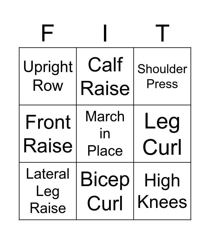 This bingo card has a free space and 11 words: Chair Stands, Bicep Curl, High Knees, Lateral Leg Raise, Calf Raise, Shoulder Press, Leg Curl, Side Step, Front Raise, Upright Row and Hammer Curl.