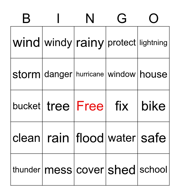 This bingo card has a free space and 24 words: rain, mess, hurricane, thunder, lightning, wind, storm, windy, fix, flood, window, bucket, water, safe, danger, shed, bike, rainy, house, tree, school, clean, protect and cover.