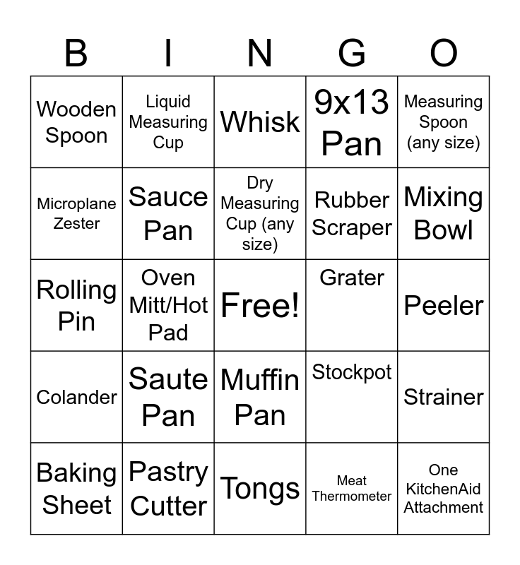 This bingo card has a free space and 24 words: Saute Pan, Pastry Cutter, Dry Measuring Cup (any size), Baking Sheet, Measuring Spoon (any size), Wooden Spoon, Microplane Zester, Liquid Measuring Cup, Grater, Muffin Pan, Rubber Scraper, Rolling Pin, Stockpot, Strainer, Sauce Pan, Meat Thermometer, Peeler, Whisk, Mixing Bowl, Oven Mitt/Hot Pad, One KitchenAid Attachment, Colander, 9x13 Pan and Tongs.