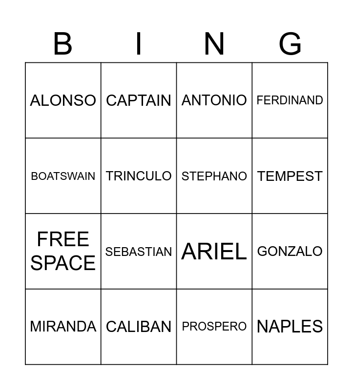 This bingo card has 17 words: PROSPERO, MIRANDA, ANTONIO, ALONSO, SEBASTIAN, FERDINAND, GONZALO, STEPHANO, TEMPEST, TRINCULO, CALIBAN, ARIEL, BOATSWAIN, CAPTAIN, FREE SPACE, MILAN and NAPLES.