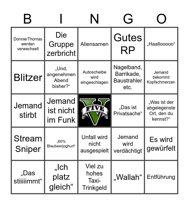 This bingo card has a free space and 24 words: „60% Blaubeerjoghurt“, „Ich platz gleich“, Autoscheibe wird eingeschlagen, „Das stiiiiimmt“, „Haallooooo“, Donnie/Thomas werden verwechselt, Blitzer, Die Gruppe zerbricht, „Das ist Privatsache“, Unfall wird nicht ausgespielt, Nagelband, Barrikade, Baustrahler etc., Jemand stirbt, Jemand wird verdächtigt, Es wird gewürfelt, „Und, angenehmen Abend bisher?“, „Wallah“, „Was ist der abgelegenste Ort, den du kennst?“, Aliensamen, Jemand bekommt Kopfschmerzen, Jemand ist nicht im Funk, Entführung, Stream Sniper, Gutes RP and Viel zu hohes Taxi-Trinkgeld.