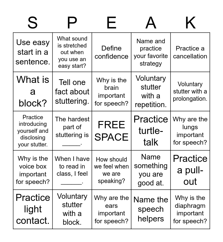 This bingo card has a free space and 29 words: Practice using pausing in a sentence., Voluntary stutter with a block., Define confidence, When are your speech strategies helpful for you?, Practice a cancellation, Use easy start in a sentence., Tell one fact about stuttering., Why is the brain important for speech?, Practice turtle-talk, Practice a pull-out, Practice light contact., The hardest part of stuttering is _____., Name the speech helpers, Why is the diaphragm important for speech?, Practice introducing yourself and disclosing your stutter., Practice stretching your sounds., Why are the ears important for speech?, Name something you are good at., Voluntary stutter with a prolongation., Why is the voice box important for speech?, When I have to read in class, I feel ______., Why are the lips and teeth important for speech?, Voluntary stutter with a repetition., Why are the lungs important for speech?, What is a block?, What sound is stretched out when you use an easy start?, How should we feel when we are speaking?, Name and practice your favorite strategy and What is stuttering?.