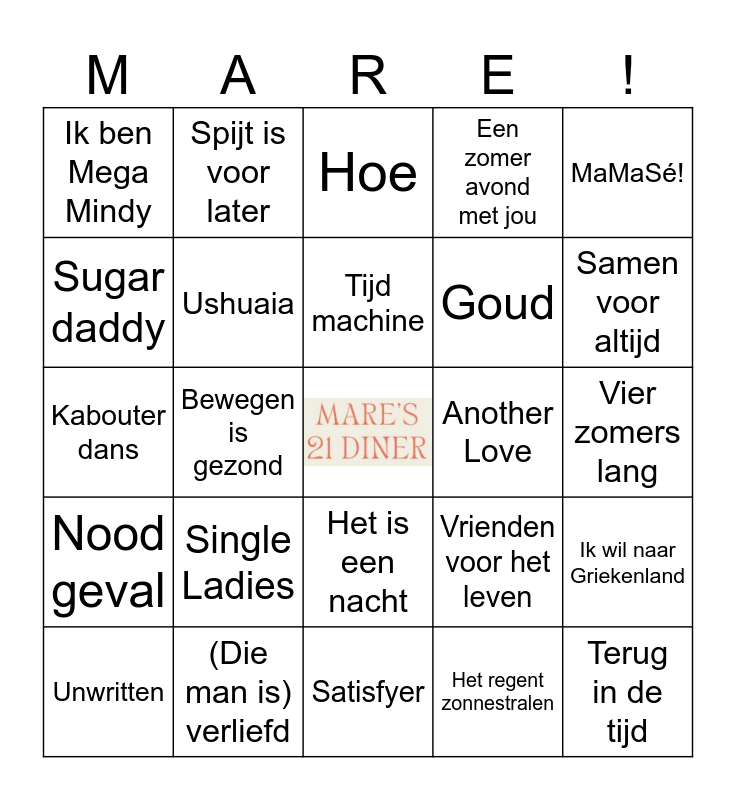 This bingo card has a free space and 50 words: Mare, dit is je verjaardag, Terug in de tijd, Girls just want to have fun, Satisfyer, Single Ladies, Huisfeestje, Spijt is voor later, Waka Waka, Sugar daddy, Padellen, Ushuaia, Een zomer avond met jou, Ik wil naar Griekenland, Vrienden voor het leven, Viva La Vida, Anne-Fleur vakantie, Tijd machine, Another Love, Blijf je vanavond, MaMaSé!, Bewegen is gezond, Het regent zonnestralen, Ik ben Mega Mindy, Goud, Kleine vogel, Parada de Tettas, Samen voor altijd, Mijntje, Hoe, Het is een nacht, Kusjes dag, Als de morgen is gekomen, Rood, Can't Hold us, (Die man is) verliefd, Eleonora, Wat is dan liefde, Stiekem gedanst, Una chica Especial, Vier zomers lang, Danny's autopaleis, Mijn stad, Lotje, Vlucht strook, Unwritten, Kabouter dans, Ken je dat gevoel, UHUH, Nood geval and Vlieger lied.