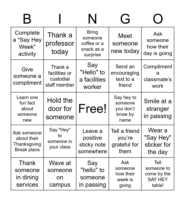 This bingo card has a free space and 24 words: Say "Hey" to someone in your class, Wave at someone on campus, Say "Hello" to a facilities worker, Thank someone in dining services, Ask someone how their day is going, Complete a "Say Hey Week" activity, Give someone a compliment, Thank a professor today, Say hey to someone you don’t know by name, Leave a positive sticky note somewhere, Send an encouraging text to a friend, Learn one fun fact about someone new, Tell a friend you’re grateful for them, Wear a "Say Hey" sticker for the day, Thank a facilities or custodial staff member, Ask someone how their week is going, Smile at a stranger in passing, Bring someone coffee or a snack as a surprise, Compliment a classmate’s work, Hold the door for someone, Tell someone to come by the SAY HEY table!, Ask someone about their Thanksgiving Break plans, Meet someone new today and Say "hello" to someone in passing.
