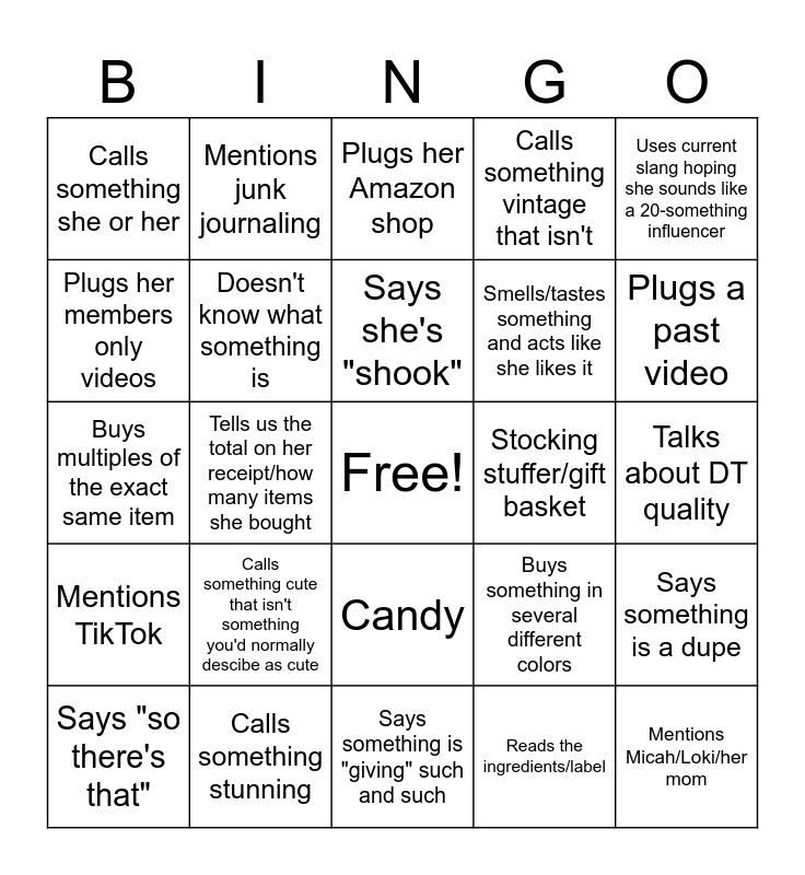 This bingo card has a free space and 24 words: Calls something cute that isn't something you'd normally descibe as cute, Calls something stunning, Says she's "shook", Says "so there's that", Uses current slang hoping she sounds like a 20-something influencer, Calls something she or her, Plugs her members only videos, Mentions junk journaling, Stocking stuffer/gift basket, Candy, Smells/tastes something and acts like she likes it, Buys multiples of the exact same item, Buys something in several different colors, Says something is a dupe, Doesn't know what something is, Reads the ingredients/label, Talks about DT quality, Plugs her Amazon shop, Plugs a past video, Tells us the total on her receipt/how many items she bought, Mentions Micah/Loki/her mom, Mentions TikTok, Calls something vintage that isn't and Says something is "giving" such and such.