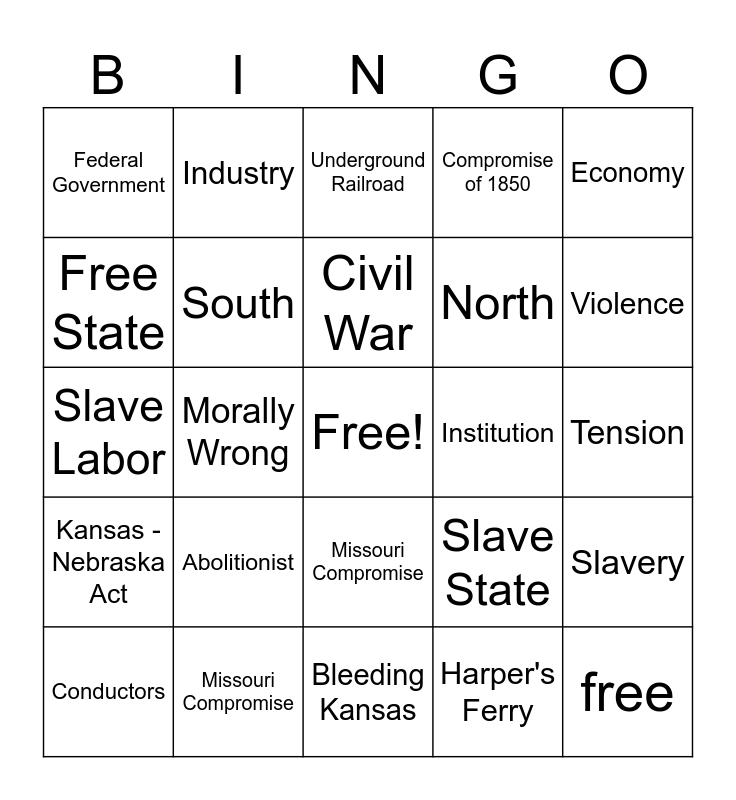 This bingo card has a free space and 25 words: Abolitionist, Bleeding Kansas, Civil War, Conductors, Economy, Federal Government, Free State, Industry, Institution, Missouri Compromise, North, Slave Labor, Slave State, Slavery, South, States' Rights, Tension, Underground Railroad, Violence, Morally Wrong, free, Missouri Compromise, Kansas - Nebraska Act, Compromise of 1850 and Harper's Ferry.