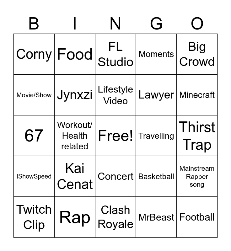 This bingo card has a free space and 24 words: Kai Cenat, Rap, Lifestyle Video, Twitch Clip, Big Crowd, Corny, Movie/Show, Food, Travelling, Concert, Lawyer, 67, Basketball, Mainstream Rapper song, Jynxzi, MrBeast, Thirst Trap, FL Studio, Minecraft, Workout/ Health related, Football, IShowSpeed, Moments and Clash Royale.