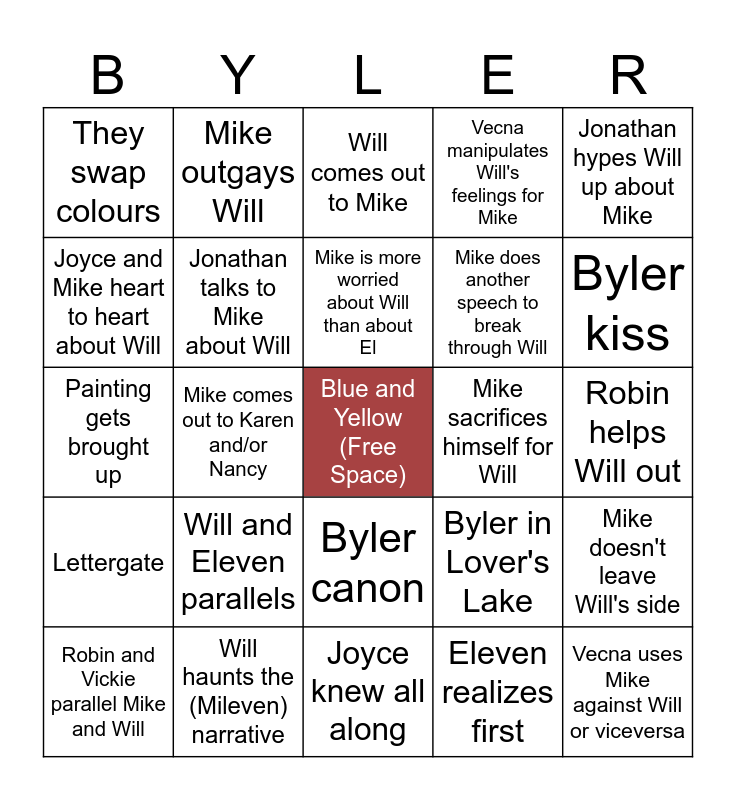 This bingo card has a free space and 24 words: Will and Eleven parallels, Will haunts the (Mileven) narrative, Mike is more worried about Will than about El, Robin and Vickie parallel Mike and Will, Jonathan hypes Will up about Mike, They swap colours, Joyce and Mike heart to heart about Will, Mike outgays Will, Mike sacrifices himself for Will, Byler canon, Mike does another speech to break through Will, Painting gets brought up, Byler in Lover's Lake, Mike doesn't leave Will's side, Jonathan talks to Mike about Will, Eleven realizes first, Robin helps Will out, Will comes out to Mike, Byler kiss, Mike comes out to Karen and/or Nancy, Vecna uses Mike against Will or viceversa, Lettergate, Vecna manipulates Will's feelings for Mike and Joyce knew all along.