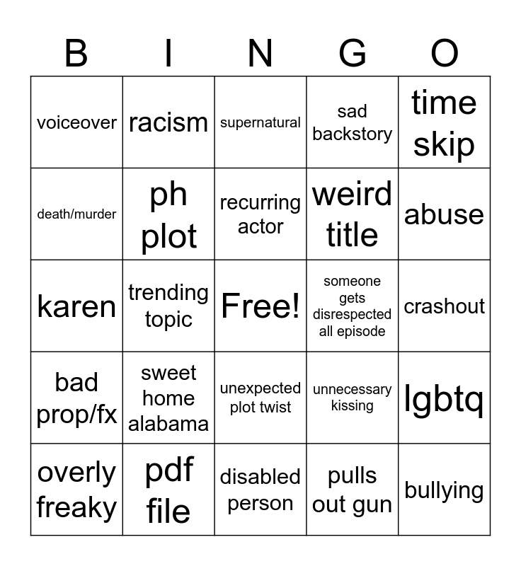 This bingo card has a free space and 24 words: sweet home alabama, pdf file, recurring actor, overly freaky, time skip, voiceover, death/murder, racism, someone gets disrespected all episode, unexpected plot twist, weird title, karen, unnecessary kissing, lgbtq, ph plot, pulls out gun, crashout, supernatural, abuse, trending topic, bullying, bad prop/fx, sad backstory and disabled person.