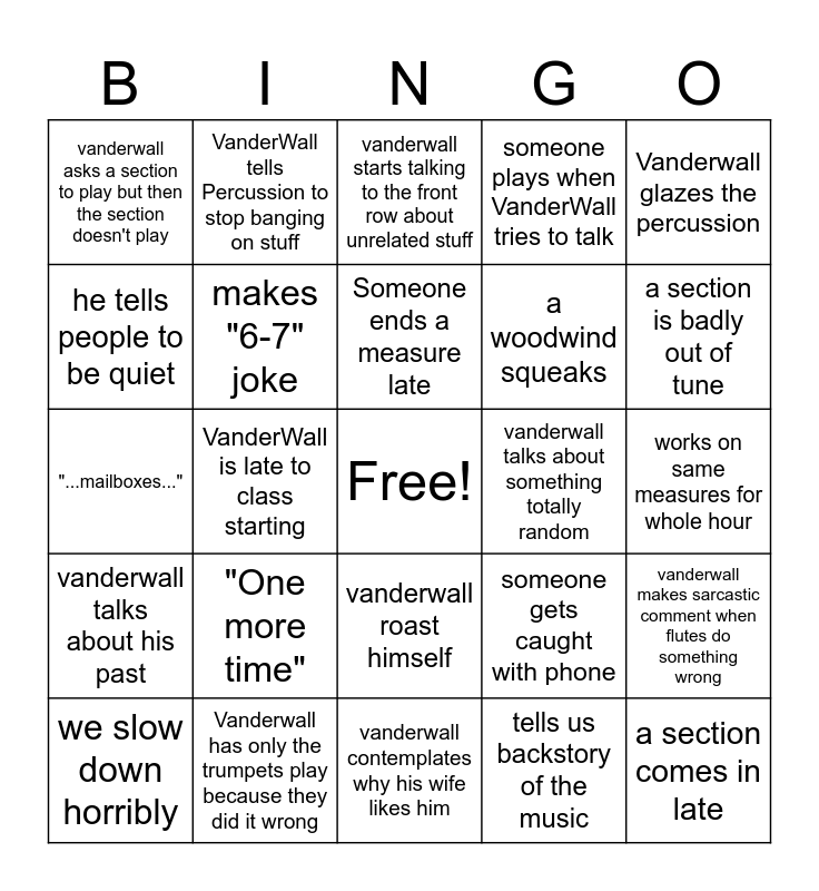 This bingo card has a free space and 24 words: "One more time", Vanderwall has only the trumpets play because they did it wrong, Someone ends a measure late, we slow down horribly, Vanderwall glazes the percussion, vanderwall asks a section to play but then the section doesn't play, he tells people to be quiet, VanderWall tells Percussion to stop banging on stuff, vanderwall talks about something totally random, vanderwall roast himself, a woodwind squeaks, "...mailboxes...", someone gets caught with phone, vanderwall makes sarcastic comment when flutes do something wrong, makes "6-7" joke, tells us backstory of the music, works on same measures for whole hour, vanderwall starts talking to the front row about unrelated stuff, a section is badly out of tune, VanderWall is late to class starting, a section comes in late, vanderwall talks about his past, someone plays when VanderWall tries to talk and vanderwall contemplates why his wife likes him.
