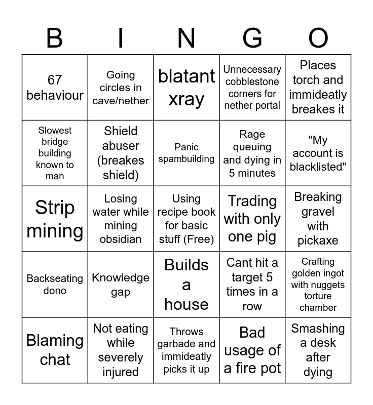 This bingo card has a free space and 24 words: Knowledge gap, Not eating while severely injured, Panic spambuilding, Blaming chat, Places torch and immideatly breakes it, 67 behaviour, Slowest bridge building known to man, Going circles in cave/nether, Trading with only one pig, Builds a house, Rage queuing and dying in 5 minutes, Strip mining, Cant hit a target 5 times in a row, Crafting golden ingot with nuggets torture chamber, Shield abuser (breakes shield), Bad usage of a fire pot, Breaking gravel with pickaxe, blatant xray, "My account is blacklisted", Losing water while mining obsidian, Smashing a desk after dying, Backseating dono, Unnecessary cobblestone corners for nether portal and Throws garbade and immideatly picks it up.