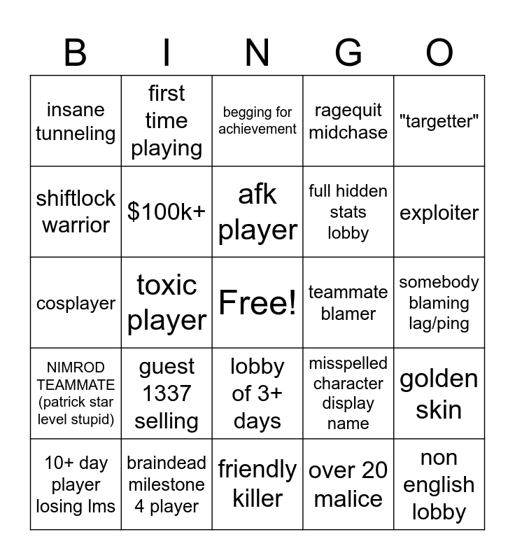 This bingo card has a free space and 24 words: guest 1337 selling, braindead milestone 4 player, afk player, 10+ day player losing lms, "targetter", insane tunneling, shiftlock warrior, first time playing, teammate blamer, lobby of 3+ days, full hidden stats lobby, cosplayer, misspelled character display name, golden skin, $100k+, over 20 malice, somebody blaming lag/ping, begging for achievement, exploiter, toxic player, non english lobby, NIMROD TEAMMATE (patrick star level stupid), ragequit midchase and friendly killer.