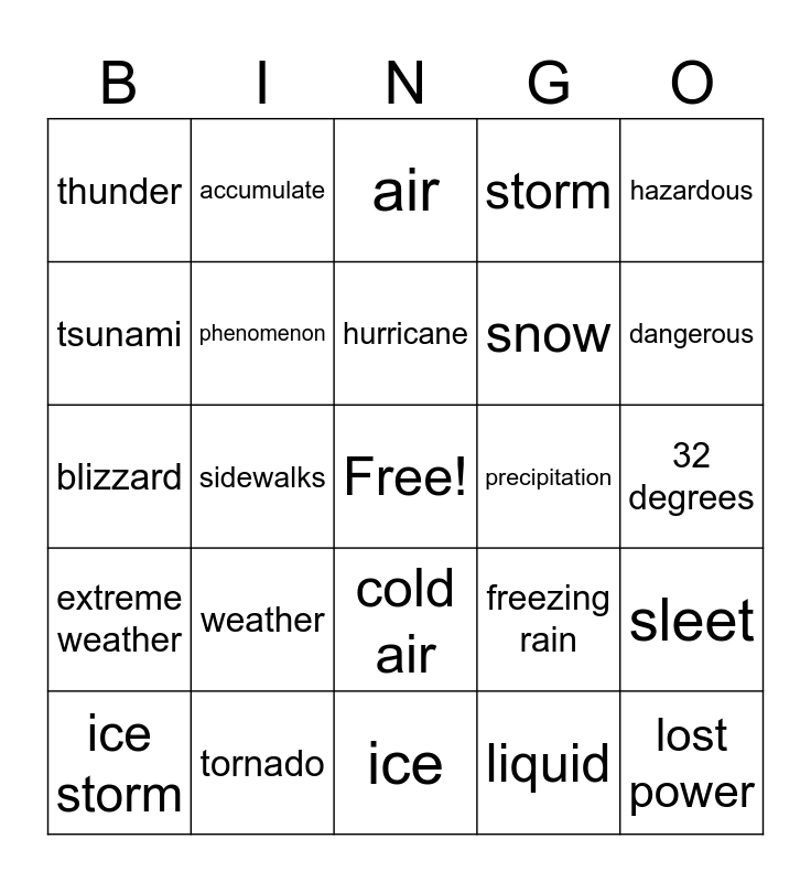 This bingo card has a free space and 24 words: weather, tornado, hurricane, ice storm, hazardous, thunder, tsunami, accumulate, precipitation, cold air, snow, blizzard, freezing rain, sleet, phenomenon, liquid, 32 degrees, air, dangerous, sidewalks, lost power, extreme weather, storm and ice.