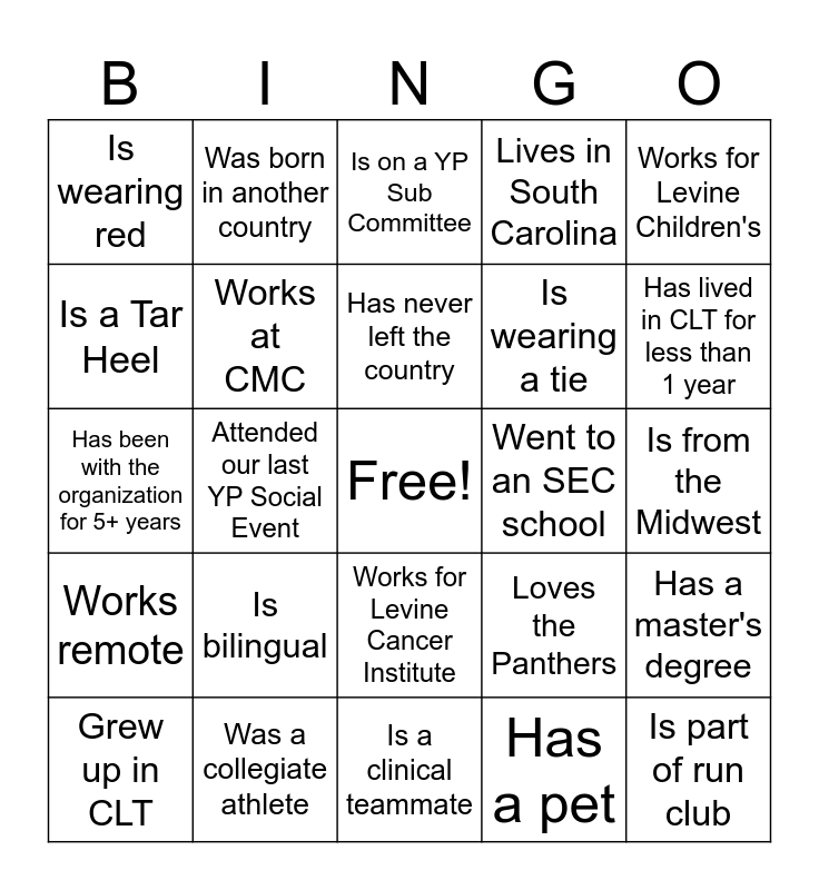 This bingo card has a free space and 24 words: Grew up in CLT, Is bilingual, Has never left the country, Has a pet, Works for Levine Children's, Is wearing red, Was born in another country, Is on a YP Sub Committee, Went to an SEC school, Is from the Midwest, Has been with the organization for 5+ years, Works at CMC, Loves the Panthers, Has a master's degree, Is a Tar Heel, Was a collegiate athlete, Is a clinical teammate, Lives in South Carolina, Has lived in CLT for less than 1 year, Works remote, Attended our last YP Social Event, Works for Levine Cancer Institute, Is wearing a tie and Is part of run club.