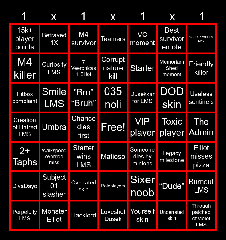 This bingo card has a free space and 62 words: Dead ringer LMS, Creation of Hatred LMS, Plead LMS, Smile LMS, Through patched of violet LMS, Burnout LMS, YOUR.PROBLEM LMS, Vanity LMS, Curiosity LMS, Perpetuity LMS, Teamers, Roleplayers, Best survivor emote, VIP player, 10+ malice, 15k+ player points, Memoriam Shed moment, VC moment, Guest whiffs block, M4 killer, Friendly killer, M4 survivor, Useless sentinels, Chance dies first, Chance dies by gun, Someone dies by minions, Walkspeed override miss, 3+ people camping, DOD skin, Elliot misses pizza, Supports targeted, Overrated skin, Underrated skin, Cosplayers, Hitbox complaint, Betrayed 1X, Sixer noob, Legacy milestone, Starter, Toxic player, Corrupt nature kill, “Dude”, ”Bro” “Bruh”, Goated 007n7, 7 Veeronicas 1 Elliot, Dusekkar for LMS, Starter wins LMS, Monster Elliot, Loveshot Dusek, Yourself skin, 035 noli, Umbra, ”Can you help me get __?”, Subject 01 slasher, Hakuri dance, The Admin, Mafioso, DivaDayo, Hacklord, Diva or Ghoul, 2+ Taphs and Two Time targeted.