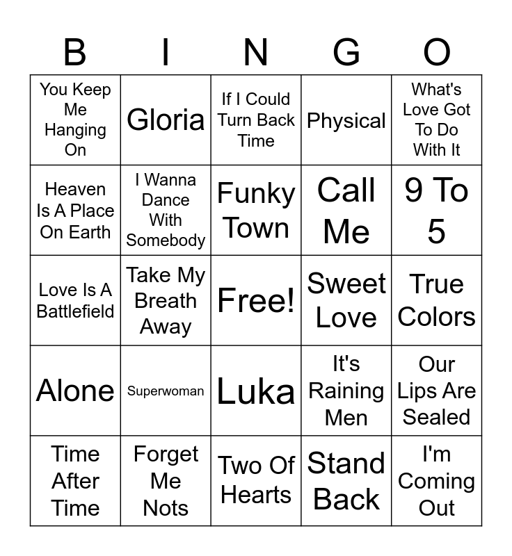 This bingo card has a free space and 33 words: Total Eclipse Of The Heart, Sweet Dreams, Take My Breath Away, Bette Davis Eyes, Alone, I Wanna Dance With Somebody, What's Love Got To Do With It, Time After Time, Gloria, I Love Rock And Roll, Funky Town, If I Could Turn Back Time, Eternal Flame, Queen Of Hearts, Sweet Love, 9 To 5, Forget Me Nots, Love Is A Battlefield, Superwoman, It's Raining Men, Luka, Genius Of Love, You Keep Me Hanging On, True Colors, Two Of Hearts, I'm Coming Out, Physical, Call Me, Heaven Is A Place On Earth, Our Lips Are Sealed, Walk Like An Egyptian, Stand Back and Straight Up.