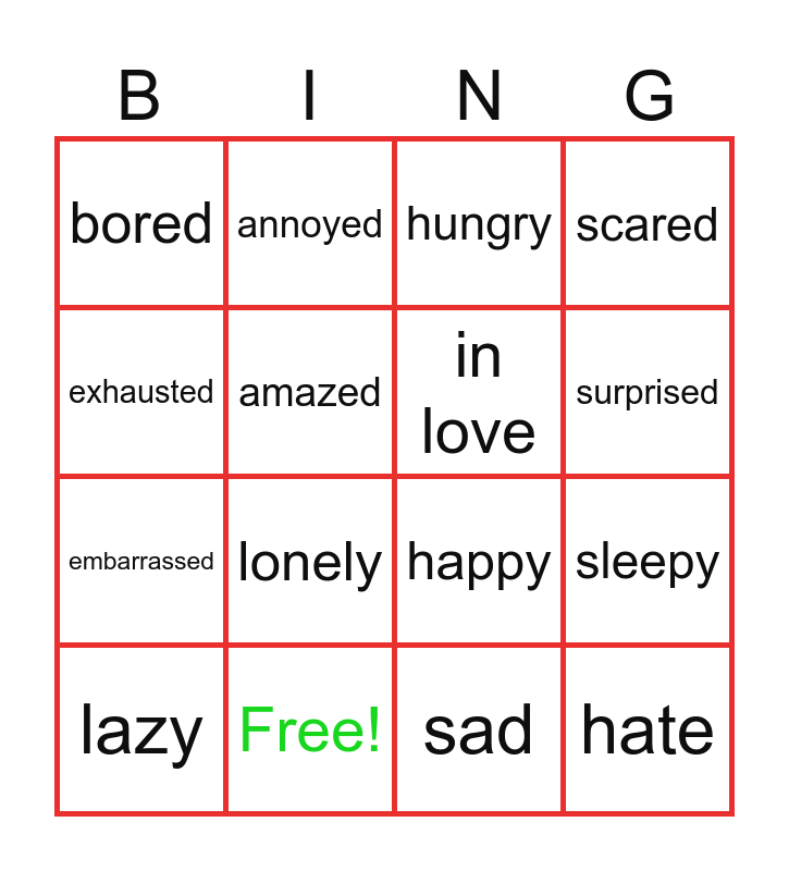 This bingo card has 25 words: excited, interested, surprised, worried, exhausted, bored, amazed, annoyed, Free!, tried, embarrassed, happy, shy, crazy, in love, angry, sad, hungry, lonely, sleepy, lazy, sick, hate, scared and smart.