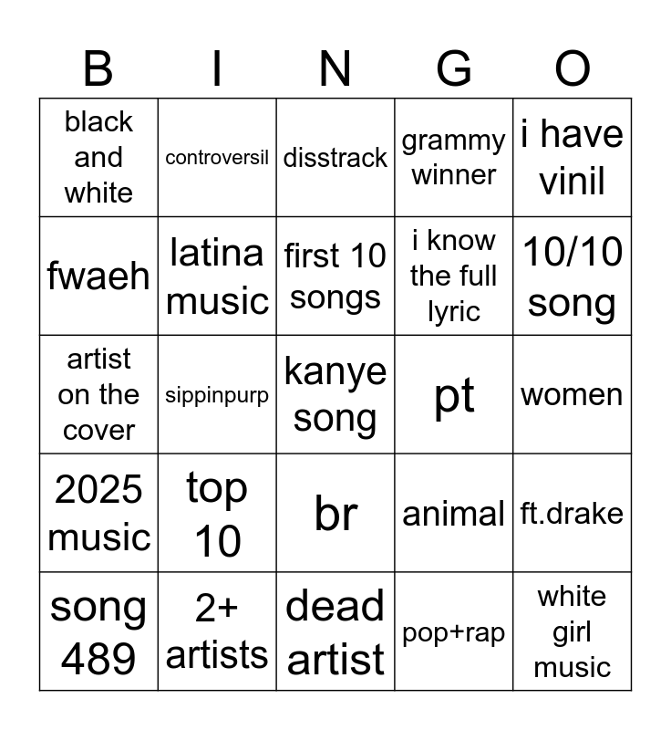 This bingo card has a free space and 24 words: top 10, 2+ artists, first 10 songs, song 489, i have vinil, black and white, fwaeh, controversil, pt, br, i know the full lyric, artist on the cover, animal, ft.drake, latina music, pop+rap, women, disstrack, 10/10 song, sippinpurp, white girl music, 2025 music, grammy winner and dead artist.