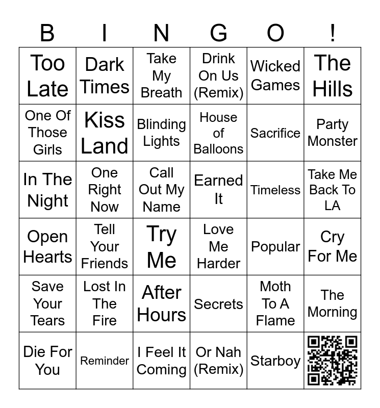 This bingo card has 1 images and 42 words: Starboy, Kiss Land, Crew Love, Timeless, Cry For Me, Tell Your Friends, In The Night, Gasoline, Take My Breath, Take Me Back To LA, Call Out My Name, House of Balloons, Party Monster, Wicked Games, Reminder, Open Hearts, The Morning, Sacrifice, !, Dark Times, The Hills, After Hours, Save Your Tears, Too Late, Heartless, Die For You, Blinding Lights, Hurt You, Lost In The Fire, Moth To A Flame, Cant Feel My Face, Earned It, One Of Those Girls, Popular, I Feel It Coming, Try Me, Love Me Harder, One Right Now, Secrets, Or Nah (Remix), Drink On Us (Remix) and Six Feet Under.