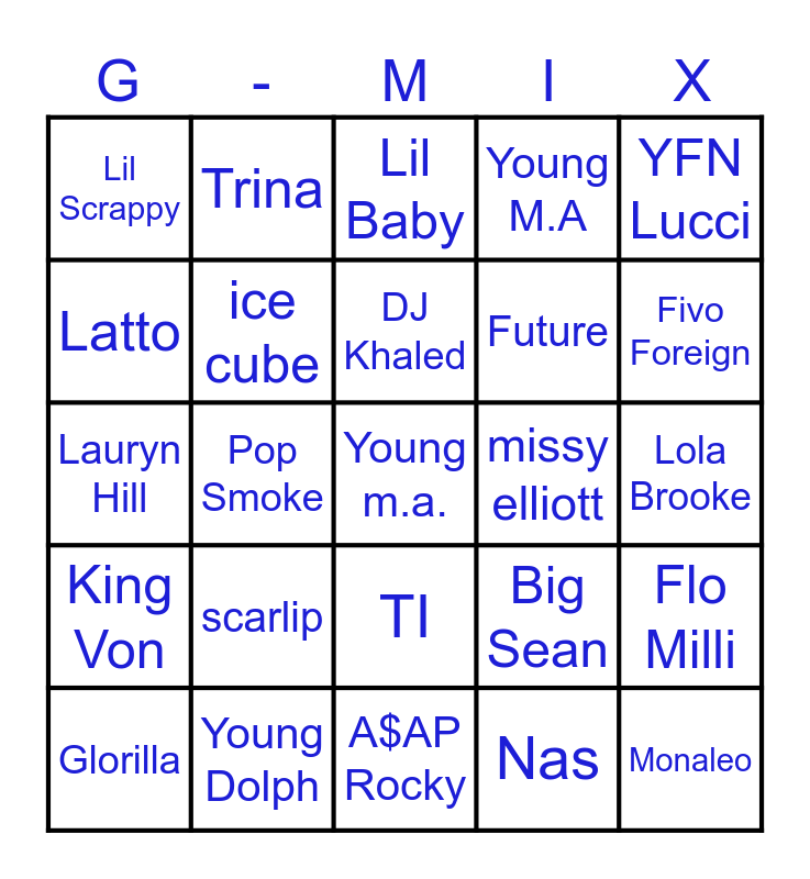 This bingo card has 119 words: Lil Scrappy,, Goodie Mob, Young Jeezy, Lil Wayne, Flo Rida, 2 Pac, Young M.A, Coi Leray, Ice Spice, Finesse 2tymes, Tee Grizzley, Kendrick Lamar, SNOOP DOGG, gucci mane, Shawty-Lo, Lil-Kim, TI, Dmx, Master P, kanye west, Glorilla, Lil Baby, Da Baby, Drake, Kodak Black, King Von, Young Dolph, Rick Ross, cam'ron, styles P, Fivo Foreign, DJ Khaled, Pop Smoke, Chief Keef, 2 Chainz, Tyler the Creator, Young M.A., J. Cole, 21 Savage, GloRilla, Jack Harlow, Jim Jones, wayne, Master p, Waka flocka, megan thee stallion, missy elliott, Nas, 50 Cent, A$AP Rocky, Lupe Fiasco, Big Sean, Travis Scott, Tyga, Busta Rhymes, Playboi Carti, Juice WRLD, Juicy J, Bun B, fetty wap, French Montana, latto, Bobby Shmurda, Dr. Dre, Roddy Ricch, ice cube, fabolous, nate dogg, Future, Lauryn Hill, Post Malone, Lola Brooke, JT, BIA, Erica Banks, Rubi Rose, Monaleo, Young m.a., scarlip, Lil Scrappy, slim shady, Project Pat, Gucci Mane, Young Jeezy, jay-z, Juvenile, Trick Daddy, Lil John, Trina, Megan Thee Stallion, Scarface, Ludacris, Young Thug, Ace Hood, Yo Gotti, Plies, YFN Lucci, Rich Homie Quan, T-Pain, Travis Porter, Boosie, Big Boogie, Kevin Gates, Moneybagg yo, NBA Youngboy, 2Pac, Notorious B.I.G., Meek Mills, Lil Kim, Nicki Minaj, sexyy red, Latto, Connie Diiamond, KASH DOLL, Remy Ma, Cardi B, Asian Doll, Flo Milli and DJ Spinz.