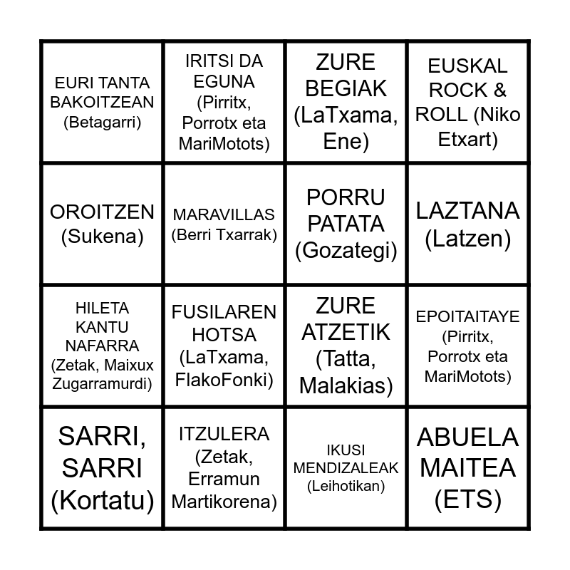 This bingo card has 52 words: KANTAURI (Süne), IRITSI DA EGUNA (Pirritx, Porrotx eta MariMotots), ELGARREKIN (Dupla, Pisso, Pantxoa eta Peio), SALDA BADAGO (Mirua), MEREZI OTE (Chill Mafia), TXANPON BATEN TRUKE (Alaitz eta Maider), PORRU PATATA (Gozategi), LOKALEKO LEIHOTIK (Sully Riot), EURI TANTA BAKOITZEAN (Betagarri), BALOREAK (Baloreak), ZURE ATZETIK (Tatta, Malakias), AUPA EPIFANIO! (Pirritx, Porrotx eta MariMotots), BERAK BADAKI (Olaia Inziarte, Hofe), ITZULERA (Zetak, Erramun Martikorena), NOAIN (Rotten XII), EZ GARA BETIRAKO (XSakara, thekminf¡d), OROITZEN (Sukena), MARAVILLAS (Berri Txarrak), UDARAKO GAU LUZEAK (Vendetta), EPOITAITAYE (Pirritx, Porrotx eta MariMotots), SARRI, SARRI (Kortatu), GURE KAIOLA (Glaukoma), ZURE BEGIAK (LaTxama, Ene), ABUELA MAITEA (ETS), ALBOKA (Axeri, Fane, Eli, FEZE, Gozategi), ASKE MAITTE (Gatibu, Izaro), TABERNAKO ARGIAK (Mconak), ZURE DOINUA (Lor), HILETA KANTU NAFARRA (Zetak, Maixux Zugarramurdi), ZARENA ZARELAKO (Sugan), BIZITZA (Xiberoots), LAZTANA (Latzen), BUELTATZEN (Goxua'n Salsa), TXADALARI (Barnaiz, Txakurdrilo, HTX rock), ALAKEN (Raimundo el Canastero), EUSKAL ROCK & ROLL (Niko Etxart), AMORE (Malakias, J Martina), AITORMENA (Hertzainak), BI T'ERDI (HTX rock, Mirua, Zetak, Monsieur leCrêpe), KOLPE (Kai Nakai), SAGARRA JO! (Kalakan), FUSILAREN HOTSA (LaTxama, FlakoFonki), IKUSI MENDIZALEAK (Leihotikan), GURE ANIMALIAK (Kantu Kolore), ERRE ZENITUZTEN (Xabi Solano Maiza), RADIO REBELDE (Añube), ARRATSALDE HONETAN (Sorotan Bele), GOGOAK (Esne Beltza), EH SUKARRA (EH Sukarra), TA ZER EZ DA BERDIN (Hertzainak), KAIXO! (Urtz) and ATZOKO GAI BERA (Burutik).