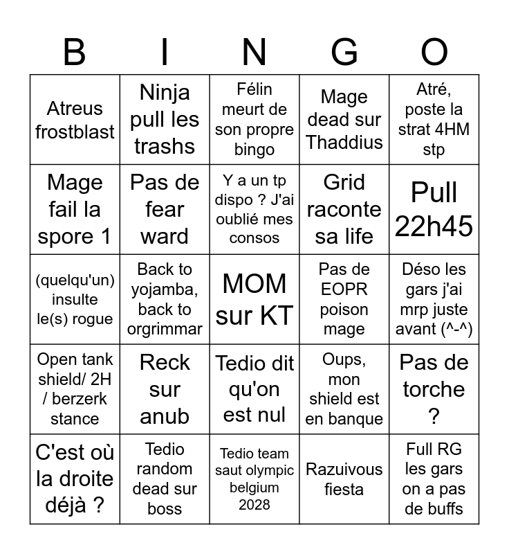 This bingo card has a free space and 24 words: Reck sur anub, Tedio random dead sur boss, Y a un tp dispo ? J'ai oublié mes consos, C'est où la droite déjà ?, Atré, poste la strat 4HM stp, Atreus frostblast, Mage fail la spore 1, Ninja pull les trashs, Pas de EOPR poison mage, Tedio dit qu'on est nul, Grid raconte sa life, (quelqu'un) insulte le(s) rogue, Oups, mon shield est en banque, Pas de torche ?, Pas de fear ward, Razuivous fiesta, Déso les gars j'ai mrp juste avant (^-^), Félin meurt de son propre bingo, Pull 22h45, Back to yojamba, back to orgrimmar, Full RG les gars on a pas de buffs, Open tank shield/ 2H / berzerk stance, Mage dead sur Thaddius and Tedio team saut olympic belgium 2028.
