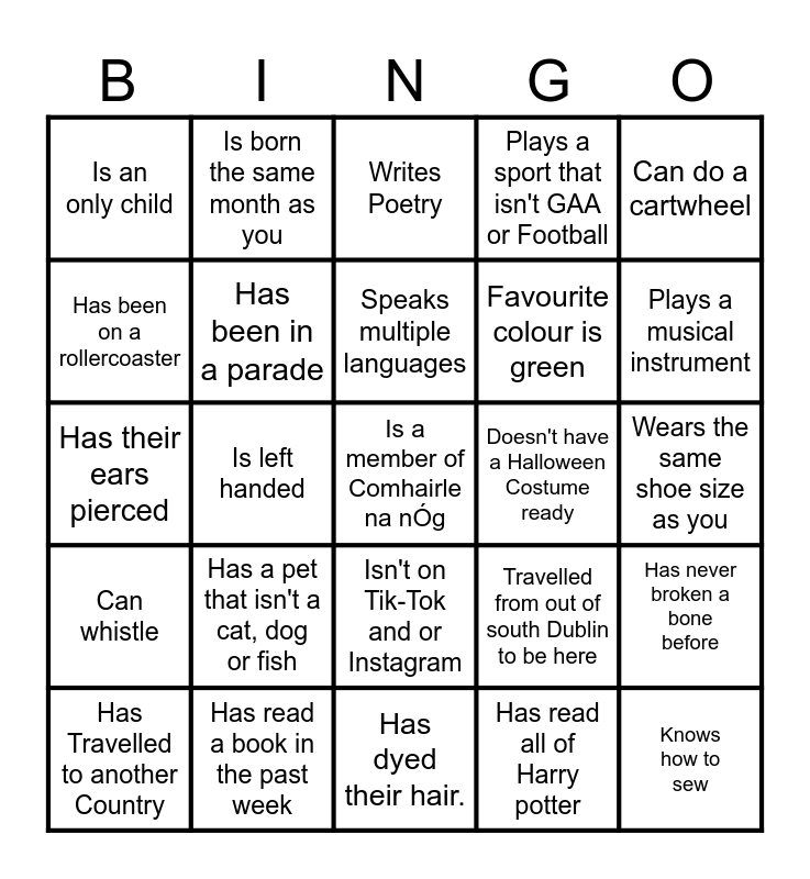 This bingo card has a free space and 24 words: Has Travelled to another Country, Has a pet that isn't a cat, dog or fish, Speaks multiple languages, Has read all of Harry potter, Can do a cartwheel, Is an only child, Is born the same month as you, Writes Poetry, Doesn't have a Halloween Costume ready, Wears the same shoe size as you, Has their ears pierced, Has been in a parade, Travelled from out of south Dublin to be here, Has never broken a bone before, Has been on a rollercoaster, Has read a book in the past week, Has dyed their hair., Plays a sport that isn't GAA or Football, Plays a musical instrument, Can whistle, Is left handed, Isn't on Tik-Tok and or Instagram, Favourite colour is green and Knows how to sew.
