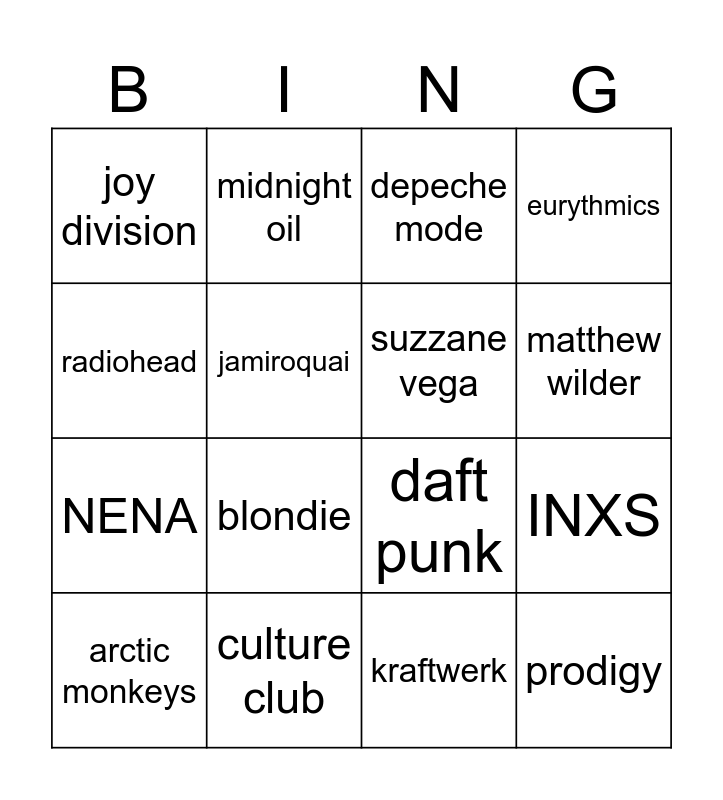 This bingo card has 16 words: culture club, INXS, depeche mode, joy division, NENA, midnight oil, daft punk, kraftwerk, radiohead, jamiroquai, arctic monkeys, eurythmics, blondie, matthew wilder, suzzane vega and prodigy.