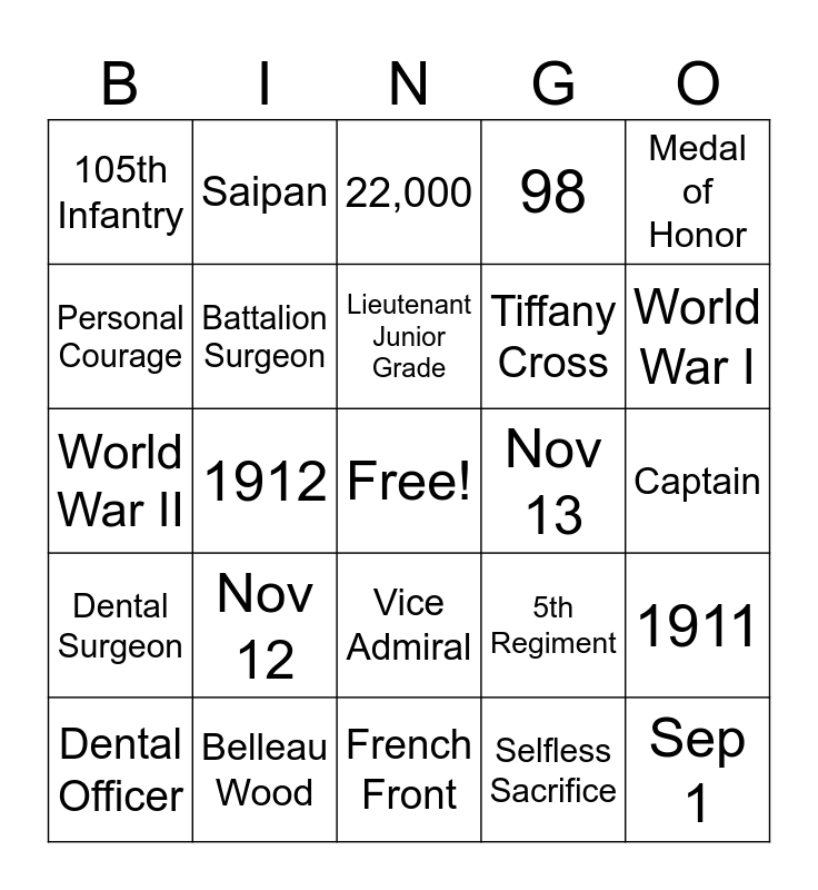 This bingo card has a free space and 24 words: Nov 12, Belleau Wood, Lieutenant Junior Grade, Dental Officer, Medal of Honor, 105th Infantry, Personal Courage, Saipan, Nov 13, Vice Admiral, Tiffany Cross, World War II, 5th Regiment, 1911, Battalion Surgeon, Selfless Sacrifice, Captain, 22,000, World War I, 1912, Sep 1, Dental Surgeon, 98 and French Front.