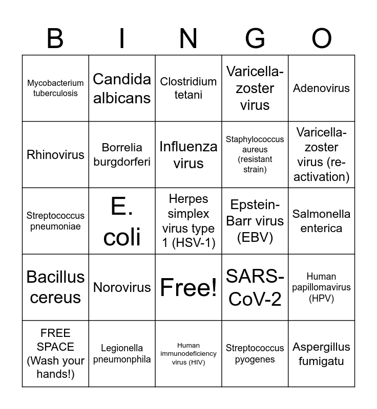 This bingo card has 26 words: Free!, Streptococcus pyogenes, Influenza virus, Legionella pneumonphila, Adenovirus, Mycobacterium tuberculosis, Rhinovirus, Candida albicans, Salmonella enterica, SARS-CoV-2, Staphylococcus aureus (resistant strain), Streptococcus pneumoniae, Human papillomavirus (HPV), FREE SPACE (Wash your hands!), E. coli, Bacillus anthracis, Varicella-zoster virus, Bacillus cereus, Clostridium tetani, Herpes simplex virus type 1 (HSV-1), Varicella-zoster virus (re-activation), Human immunodeficiency virus (HIV), Epstein-Barr virus (EBV), Norovirus, Borrelia burgdorferi and Aspergillus fumigatu.