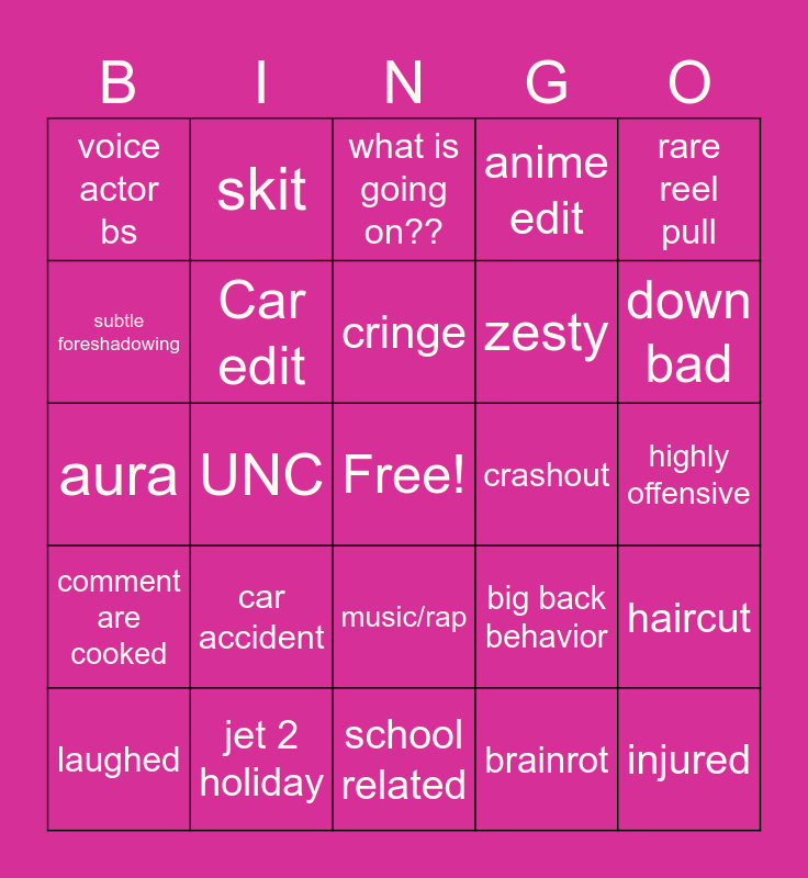 This bingo card has a free space and 24 words: car accident, jet 2 holiday, cringe, laughed, rare reel pull, voice actor bs, subtle foreshadowing, skit, crashout, music/rap, zesty, aura, big back behavior, haircut, Car edit, brainrot, highly offensive, what is going on??, down bad, UNC, injured, comment are cooked, anime edit and school related.