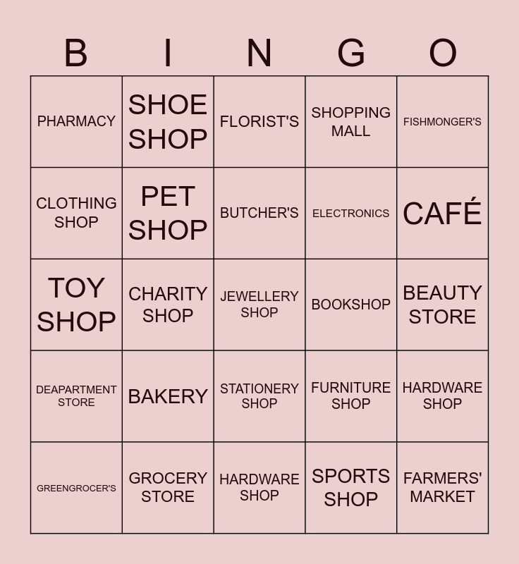 This bingo card has a free space and 24 words: BAKERY, GROCERY STORE, BUTCHER'S, GREENGROCER'S, FISHMONGER'S, PHARMACY, CLOTHING SHOP, SHOE SHOP, BOOKSHOP, STATIONERY SHOP, ELECTRONICS, TOY SHOP, FURNITURE SHOP, HARDWARE SHOP, PET SHOP, SPORTS SHOP, BEAUTY STORE, FLORIST'S, CAFÉ, CHARITY SHOP, FARMERS' MARKET, DEAPARTMENT STORE, SHOPPING MALL and HARDWARE SHOP.