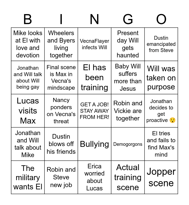This bingo card has a free space and 24 words: Dustin blows off his friends, Robin and Steve new job, El has been training, The military wants El, Dustin emancipated from Steve, Mike looks at El with love and devotion, Jonathan and Will talk about Will being gay, Wheelers and Byers living together, Robin and Vickie are together, Bullying, Baby Will suffers more than Jesus, Lucas visits Max, Demogorgons, El tries and fails to find Max's mind, Final scene is Max in Vecna's mindscape, Actual training scene, Jonathan decides to get proactive 😯, VecnaFlayer infects Will, Will was taken on purpose, Nancy ponders on Vecna's threat, Jopper scene, Jonathan and Will talk about Mike, Present day Will gets haunted and Erica worried about Lucas.