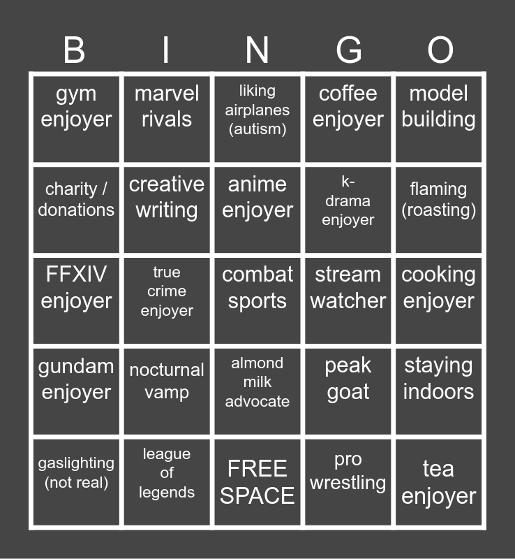 This bingo card has 25 words: gundam enjoyer, league of legends, combat sports, pro wrestling, model building, gym enjoyer, marvel rivals, liking airplanes (autism), stream watcher, staying indoors, charity / donations, creative writing, FREE SPACE, peak goat, flaming (roasting), gaslighting (not real), true crime enjoyer, anime enjoyer, k-drama enjoyer, cooking enjoyer, FFXIV enjoyer, nocturnal vamp, almond milk advocate, coffee enjoyer and tea enjoyer.