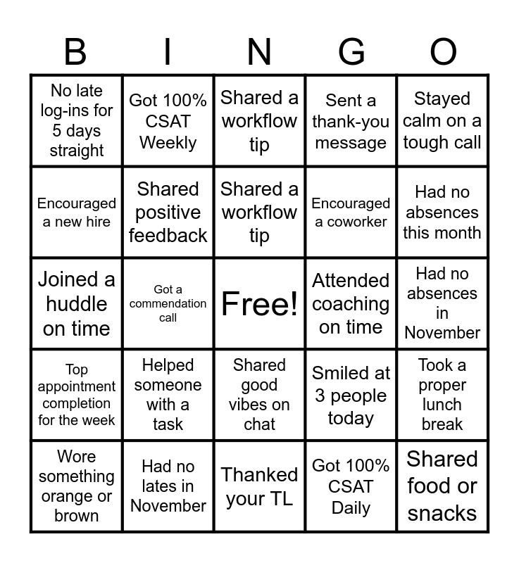 This bingo card has a free space and 24 words: Helped someone with a task, Had no lates in November, Shared a workflow tip, Wore something orange or brown, Stayed calm on a tough call, No late log-ins for 5 days straight, Encouraged a new hire, Got 100% CSAT Weekly, Attended coaching on time, Shared good vibes on chat, Encouraged a coworker, Joined a huddle on time, Smiled at 3 people today, Took a proper lunch break, Shared positive feedback, Got 100% CSAT Daily, Had no absences in November, Shared a workflow tip, Had no absences this month, Got a commendation call, Shared food or snacks, Top appointment completion for the week, Sent a thank-you message and Thanked your TL.