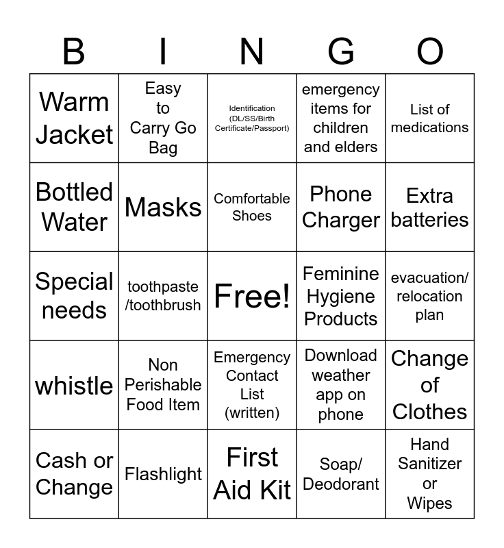 This bingo card has a free space and 24 words: Non Perishable Food Item, Flashlight, Comfortable Shoes, Cash or Change, List of medications, Warm Jacket, Bottled Water, Easy to Carry Go Bag, Feminine Hygiene Products, Emergency Contact List (written), Phone Charger, Special needs, Download weather app on phone, Change of Clothes, Masks, Soap/ Deodorant, evacuation/ relocation plan, Identification (DL/SS/Birth Certificate/Passport), Extra batteries, toothpaste /toothbrush, Hand Sanitizer or Wipes, whistle, emergency items for children and elders and First Aid Kit.