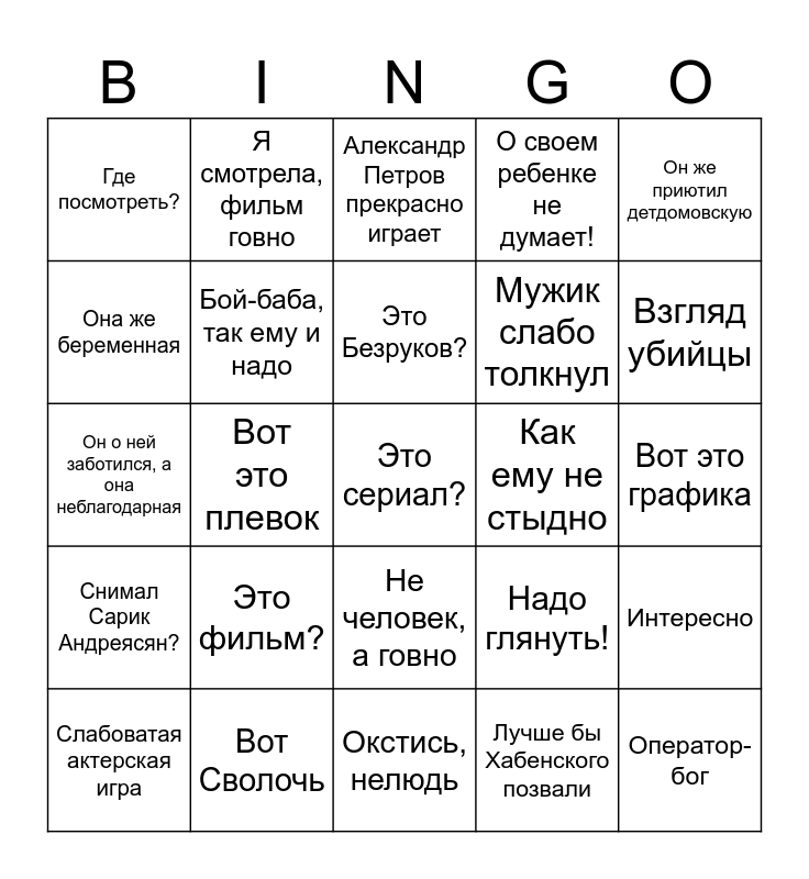 This bingo card has a free space and 24 words: Это фильм?, Вот Сволочь, Это Безруков?, Слабоватая актерская игра, Он же приютил детдомовскую, Где посмотреть?, Она же беременная, Я смотрела, фильм говно, Как ему не стыдно, Не человек, а говно, Мужик слабо толкнул, Он о ней заботился, а она неблагодарная, Надо глянуть!, Интересно, Бой-баба, так ему и надо, Лучше бы Хабенского позвали, Вот это графика, Александр Петров прекрасно играет, Взгляд убийцы, Вот это плевок, Оператор-бог, Снимал Сарик Андреясян?, О своем ребенке не думает! and Окстись, нелюдь.