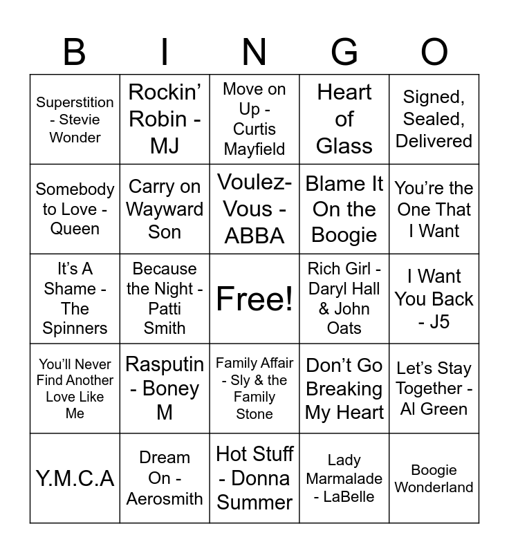 This bingo card has a free space and 30 words: The Chain - Fleetwood Mac, Dream On - Aerosmith, Move on Up - Curtis Mayfield, Shae Your Groove Thing, Signed, Sealed, Delivered, Superstition - Stevie Wonder, Carry on Wayward Son, Voulez-Vous - ABBA, Blame It On the Boogie, Boogie Wonderland, Y.M.C.A, Rasputin - Boney M, Lady Marmalade - LaBelle, What a Fool Believes - Doobie Brothers, You’ll Never Find Another Love Like Me, Ain’t No Mountain High Enough, Hot Stuff - Donna Summer, Rich Girl - Daryl Hall & John Oats, Let’s Stay Together - Al Green, Somebody to Love - Queen, Because the Night - Patti Smith, More Than a Woman, Heart of Glass, I Want You Back - J5, It’s A Shame - The Spinners, Rockin’ Robin - MJ, Family Affair - Sly & the Family Stone, Don’t Go Breaking My Heart, You’re the One That I Want and Tired of Being Alone - Al Green.