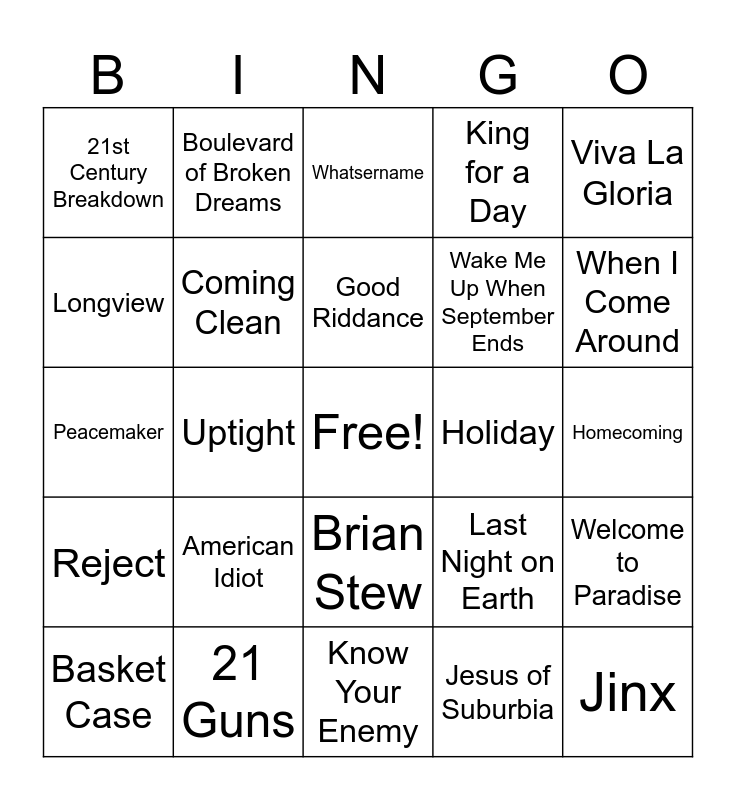 This bingo card has a free space and 24 words: American Idiot, 21 Guns, Good Riddance, Basket Case, Viva La Gloria, 21st Century Breakdown, Longview, Boulevard of Broken Dreams, Holiday, Brian Stew, Wake Me Up When September Ends, Peacemaker, Last Night on Earth, Welcome to Paradise, Coming Clean, Jesus of Suburbia, Homecoming, Whatsername, When I Come Around, Uptight, Jinx, Reject, King for a Day and Know Your Enemy.