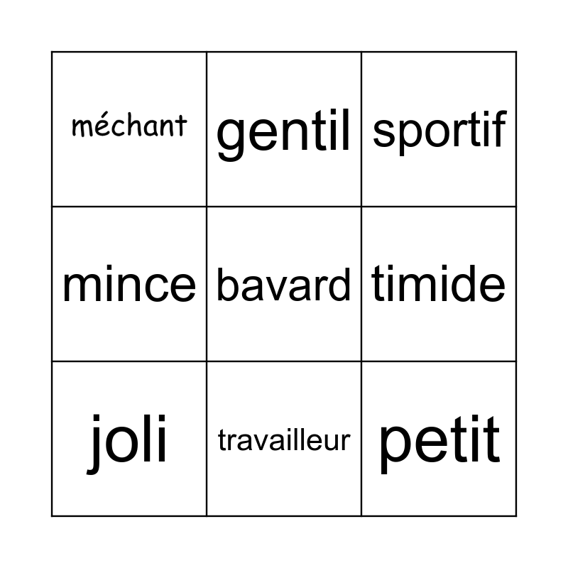 This bingo card has 2 images and 10 words: grand, petit, bavard, timide, gentil, sportif, travailleur, mince, joli and beau.