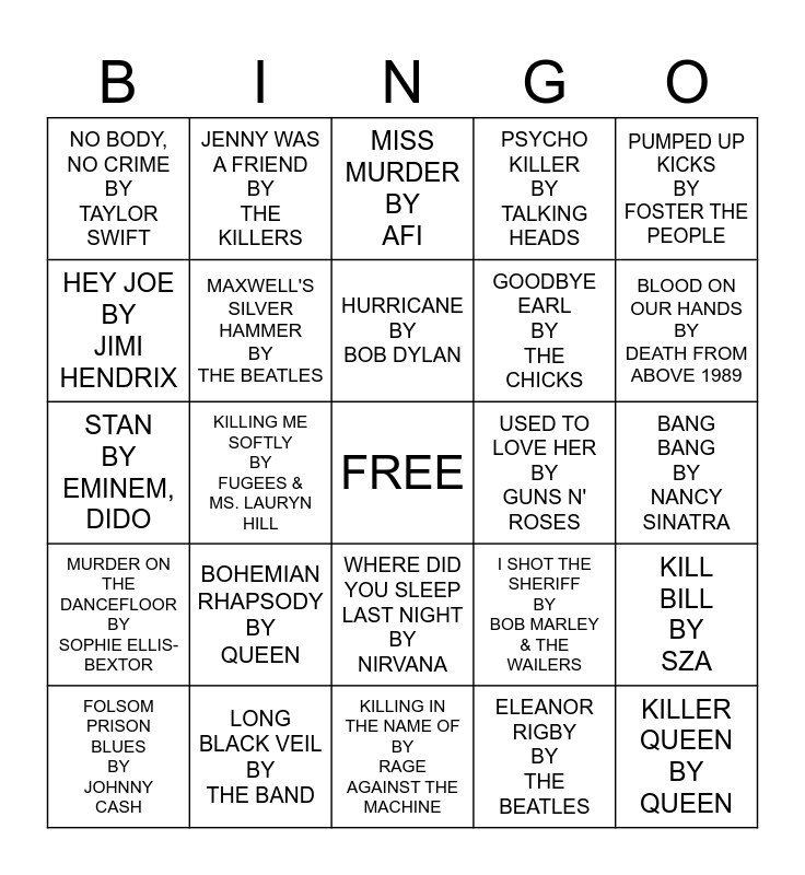 This bingo card has a free space and 24 words: BOHEMIAN RHAPSODY BY QUEEN, LONG BLACK VEIL BY THE BAND, HURRICANE BY BOB DYLAN, FOLSOM PRISON BLUES BY JOHNNY CASH, PUMPED UP KICKS BY FOSTER THE PEOPLE, NO BODY, NO CRIME BY TAYLOR SWIFT, HEY JOE BY JIMI HENDRIX, JENNY WAS A FRIEND BY THE KILLERS, USED TO LOVE HER BY GUNS N' ROSES, WHERE DID YOU SLEEP LAST NIGHT BY NIRVANA, GOODBYE EARL BY THE CHICKS, STAN BY EMINEM, DIDO, I SHOT THE SHERIFF BY BOB MARLEY & THE WAILERS, KILL BILL BY SZA, MAXWELL'S SILVER HAMMER BY THE BEATLES, ELEANOR RIGBY BY THE BEATLES, BANG BANG BY NANCY SINATRA, MISS MURDER BY AFI, BLOOD ON OUR HANDS BY DEATH FROM ABOVE 1989, KILLING ME SOFTLY BY FUGEES & MS. LAURYN HILL, KILLER QUEEN BY QUEEN, MURDER ON THE DANCEFLOOR BY SOPHIE ELLIS-BEXTOR, PSYCHO KILLER BY TALKING HEADS and KILLING IN THE NAME OF BY RAGE AGAINST THE MACHINE.