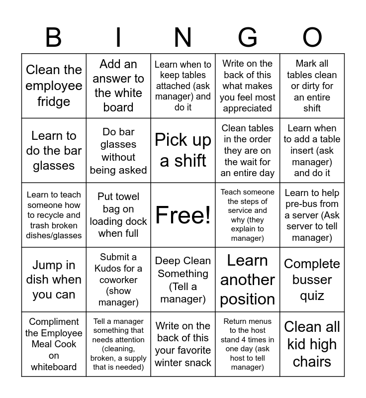 This bingo card has a free space and 24 words: Submit a Kudos for a coworker (show manager), Tell a manager something that needs attention (cleaning, broken, a supply that is needed), Pick up a shift, Compliment the Employee Meal Cook on whiteboard, Mark all tables clean or dirty for an entire shift, Clean the employee fridge, Learn to do the bar glasses, Add an answer to the white board, Teach someone the steps of service and why (they explain to manager), Deep Clean Something (Tell a manager), Clean tables in the order they are on the wait for an entire day, Learn to teach someone how to recycle and trash broken dishes/glasses, Learn another position, Complete busser quiz, Do bar glasses without being asked, Return menus to the host stand 4 times in one day (ask host to tell manager), Learn to help pre-bus from a server (Ask server to tell manager), Learn when to keep tables attached (ask manager) and do it, Learn when to add a table insert (ask manager) and do it, Put towel bag on loading dock when full, Clean all kid high chairs, Jump in dish when you can, Write on the back of this what makes you feel most appreciated and Write on the back of this your favorite winter snack.