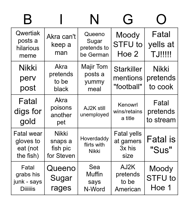 This bingo card has a free space and 24 words: Nikki snaps a fish pic for Steven, Queeno Sugar rages, Majir Tom posts a yummy meal, Fatal grabs his junk - says Diiiiiis, Fatal yells at TJ!!!!!, Qwertiak posts a hilarious meme, Nikki perv post, Akra can't keep a man, Kenowrl wins/retains a title, Hoverdaddy flirts with Nikki, Starkiller mentions "football", Fatal digs for gold, Fatal yells at gamers 3x his size, Fatal is "Sus", Akra pretends to be black, AJ2K pretends to be American, Fatal pretends to stream, Queeno Sugar pretends to be German, Nikki pretends to cook, Akra poisons another pet, Moody STFU to Hoe 1, Fatal wear gloves to eat (not the fish), Moody STFU to Hoe 2 and Sea Muffin says N-Word.