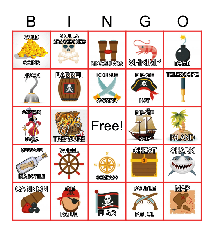 This bingo card has 30 images, a free space and 30 words: ANCHOR, EYE PATCH, BINOCULARS, DOUBLE PISTOL, BOMB, GOLD COINS, BARREL, DOUBLE SWORD, PIRATE HAT, MAP, PIRATE, WHEEL, CHEST, BANDANA, CANNON, PARROT, FLAG, PIRATE SHIP, ISLAND, HOOK, TREASURE, SWORD, SHRIMP, TELESCOPE, CAPTAIN HOOK, SKULL & CROSSBONES, COMPASS, SHARK, MESSAGE IN A BOTTLE and SKULL.