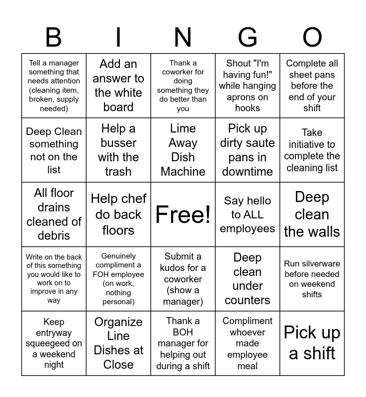 This bingo card has a free space and 24 words: Genuinely compliment a FOH employee (on work, nothing personal), Organize Line Dishes at Close, Lime Away Dish Machine, Keep entryway squeegeed on a weekend night, Complete all sheet pans before the end of your shift, Tell a manager something that needs attention (cleaning item, broken, supply needed), Deep Clean something not on the list, Add an answer to the white board, Say hello to ALL employees, Submit a kudos for a coworker (show a manager), Pick up dirty saute pans in downtime, All floor drains cleaned of debris, Deep clean under counters, Run silverware before needed on weekend shifts, Help a busser with the trash, Compliment whoever made employee meal, Deep clean the walls, Thank a coworker for doing something they do better than you, Take initiative to complete the cleaning list, Help chef do back floors, Pick up a shift, Write on the back of this something you would like to work on to improve in any way, Shout "I'm having fun!" while hanging aprons on hooks and Thank a BOH manager for helping out during a shift.