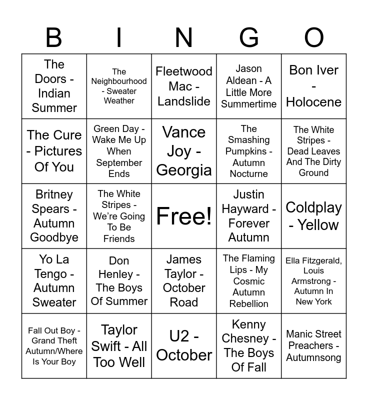 This bingo card has a free space and 42 words: Earth, Wind, And Fire - September, Green Day - Wake Me Up When September Ends, Neil Young - Harvest Moon, Kenny Chesney - The Boys Of Fall, Death Cab For Cutie - Autumn Love, Fall Out Boy - Grand Theft Autumn/Where Is Your Boy, Don Henley - The Boys Of Summer, Billy Talent - Fallen Leaves, Jason Aldean - A Little More Summertime, Ella Fitzgerald, Louis Armstrong - Autumn In New York, Yo La Tengo - Autumn Sweater, The White Stripes - We’re Going To Be Friends, The Flaming Lips - My Cosmic Autumn Rebellion, The White Stripes - Dead Leaves And The Dirty Ground, Nat King Cole - Autumn Leaves, Taylor Swift - All Too Well, Ed Sheeran - Autumn Leaves, Justin Hayward - Forever Autumn, The Stranglers - Golden Brown, The Doors - Indian Summer, The Neighbourhood - Sweater Weather, U2 - October, James Taylor - September Grass, Bon Iver - Holocene, Lana Del Rey - RIde, Adele - Someone Like You, Fleetwood Mac - Landslide, Guns N’ Roses - November Rain, KT Tunstall - Suddenly I See, James Taylor - October Road, Maggie Rogers - Alaska, Coldplay - Yellow, The Cure - Pictures Of You, Vance Joy - Georgia, Luke Bryan - Harvest Time, Van Morisson - Moondance, Manic Street Preachers - Autumnsong, Britney Spears - Autumn Goodbye, Fiona Apple - Pale September, From Autumn To Ashes - Autumns Monologue, The Smashing Pumpkins - Autumn Nocturne and Noah Kahan - Stick Season.