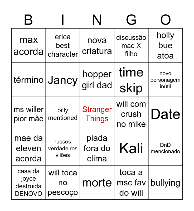 This bingo card has a free space and 24 words: russos verdadeiros vilões, will toca no pescoço, hopper girl dad, casa da joyce destruida DENOVO, holly bue atoa, max acorda, término, erica best character, will com crush no mike, piada fora do clima, time skip, ms willer pior mãe, Kali, DnD mencionado, Jancy, toca a msc fav do will, Date, nova criatura, novo personagem inútil, billy mentioned, bullying, mae da eleven acorda, discussão mae X filho and morte.